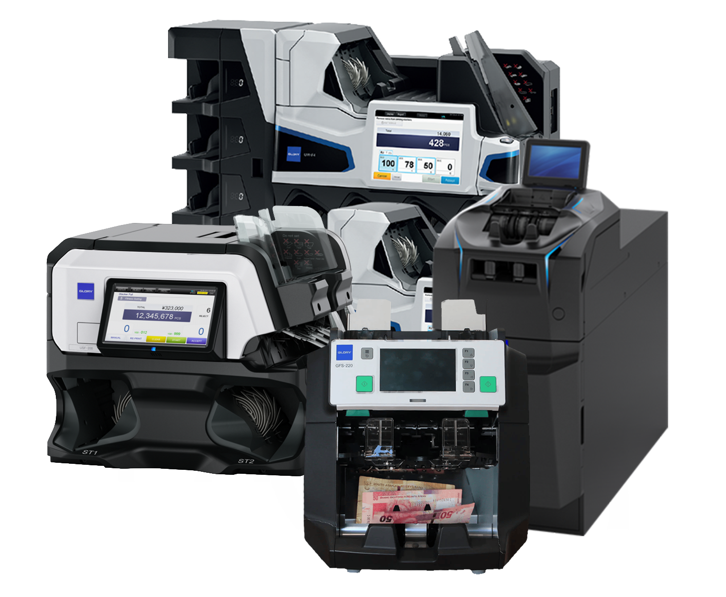 GLORY ofrece soluciones adaptables para bancos, supermercados, estaciones de servicio, y cualquier negocio que maneje altos volúmenes de efectivo.